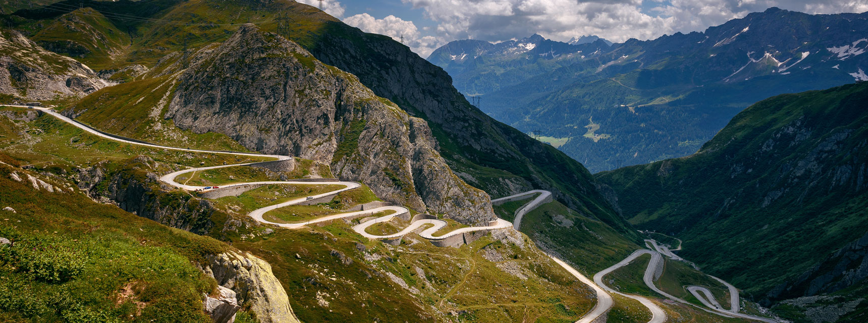 Today we head south toward the Ticino region. We climb the Nufenen Pass, the highest paved road in Switzerland, which offers clear views across the Bernese Alps. For the return, we take the historic St. Gotthard Pass via the Tremola. This old road is surfaced with hand-laid granite cobbles, providing a unique, tactile driving experience in a Caterham.